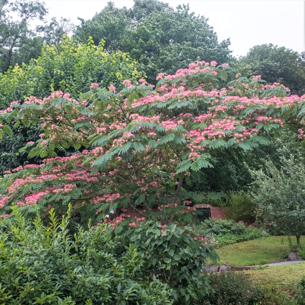 Succombez Ă la dĂ©licate floraison soyeuse de lâalbizia julibrissin, appelĂ© aussi acacia de Constantinople, mimosa de Constantinople et mĂȘme arbre de soie. Ses pompons rose pĂąle sâĂ©panouissent en juillet aoĂ»t sur un arbre Ă la silhouette gracieusement Ă©vasĂ©e, garnie dâun feuillage lĂ©ger. Peu exigeant et bien rustique, câest un excellent arbre dâombrage Ă planter Ă proximitĂ© de la terrasse, en isolĂ© sur fond de pelouse ou en alignement !