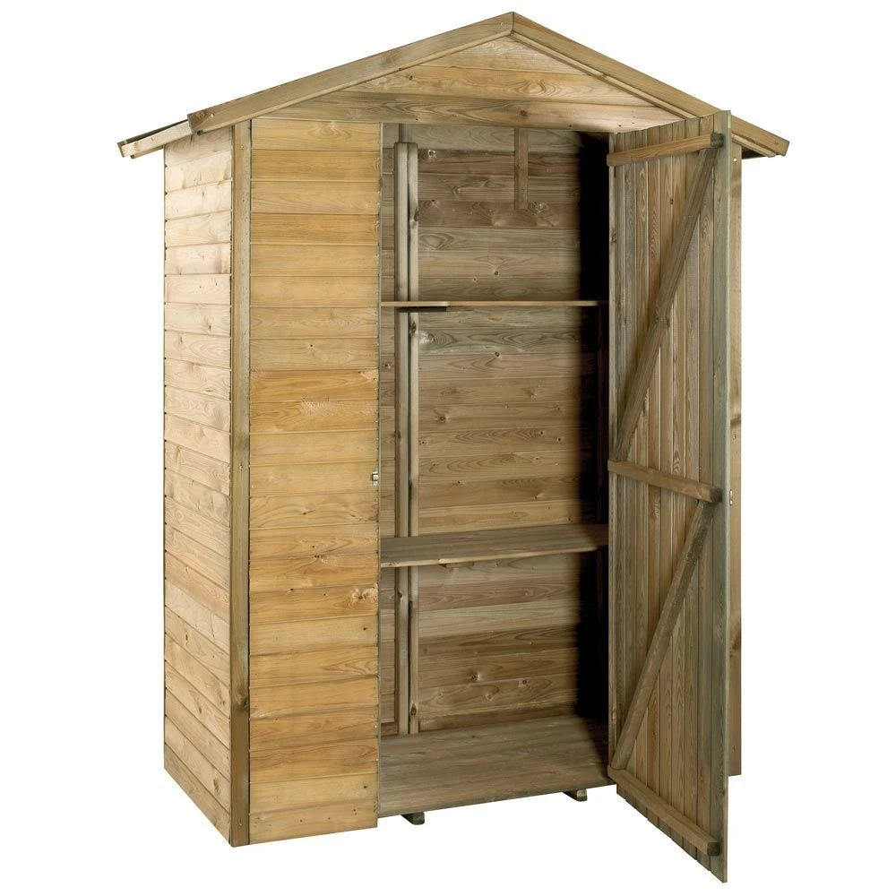 Pour ranger tout le matériel de jardinage. Une grande sobriété, un faible encombrement au sol et une grande praticité sont les caractéristiques principales de cette armoire. En pin traité autoclave, elle résistera aux agressions extérieures. Armoire de rangement livrée avec quincaillerie pour la fixation de la porte, avec 2 étagÚres + plancher, et couverture bitumée.