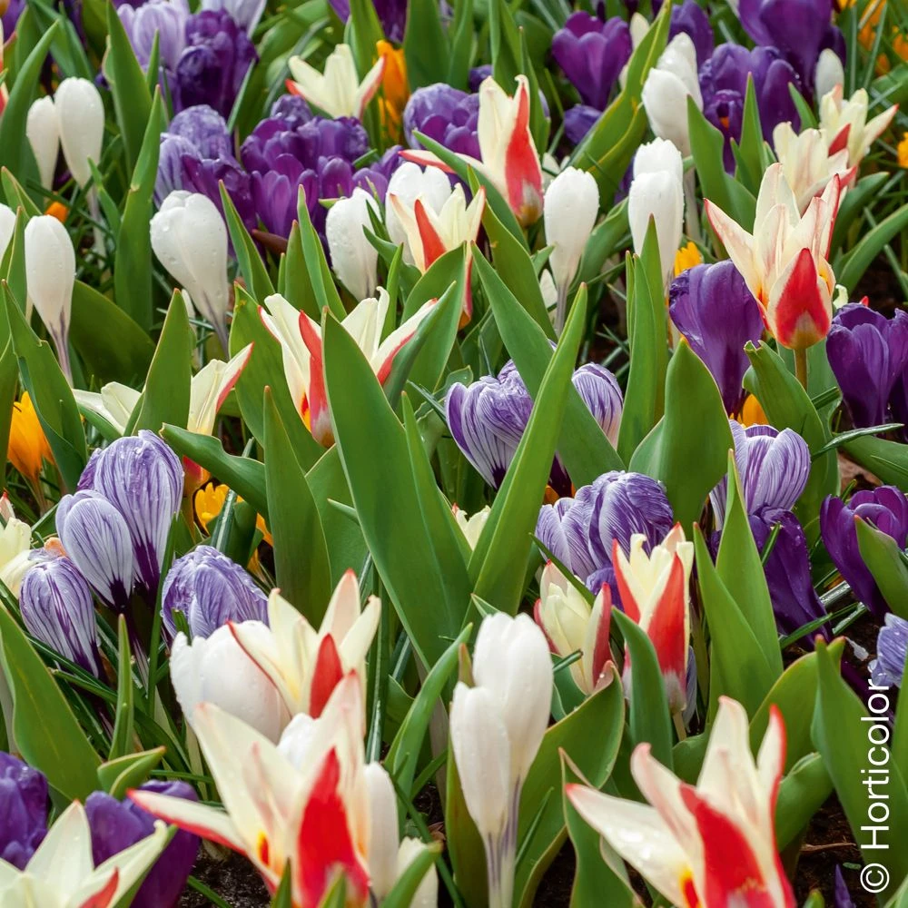 - 70 % de Crocus vernus à Grandes fleurs mélange, aux tons bleus, violets, blancs, jaunes, etc.