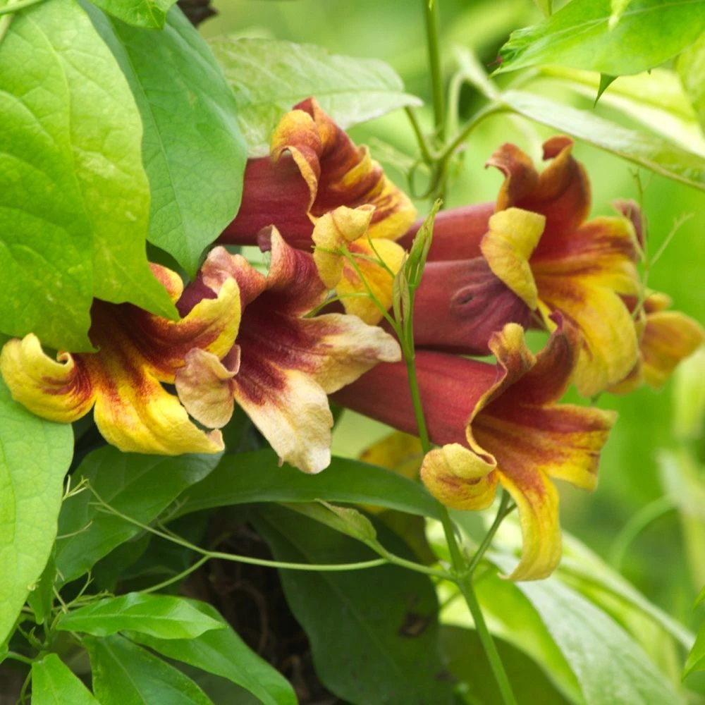 Les fleurs du Bignonia capreolata s’épanouissent de mai à juillet, parfois dès avril en climat doux. Elles se présentent sou la forme de belles trompettes bicolores, rouge bordeaux à l’extérieur et jaune orangé à gorge rouge à l’intérieur. Ces tonalités originales donnent un effet étonnamment contrasté sur une seule et même plante.