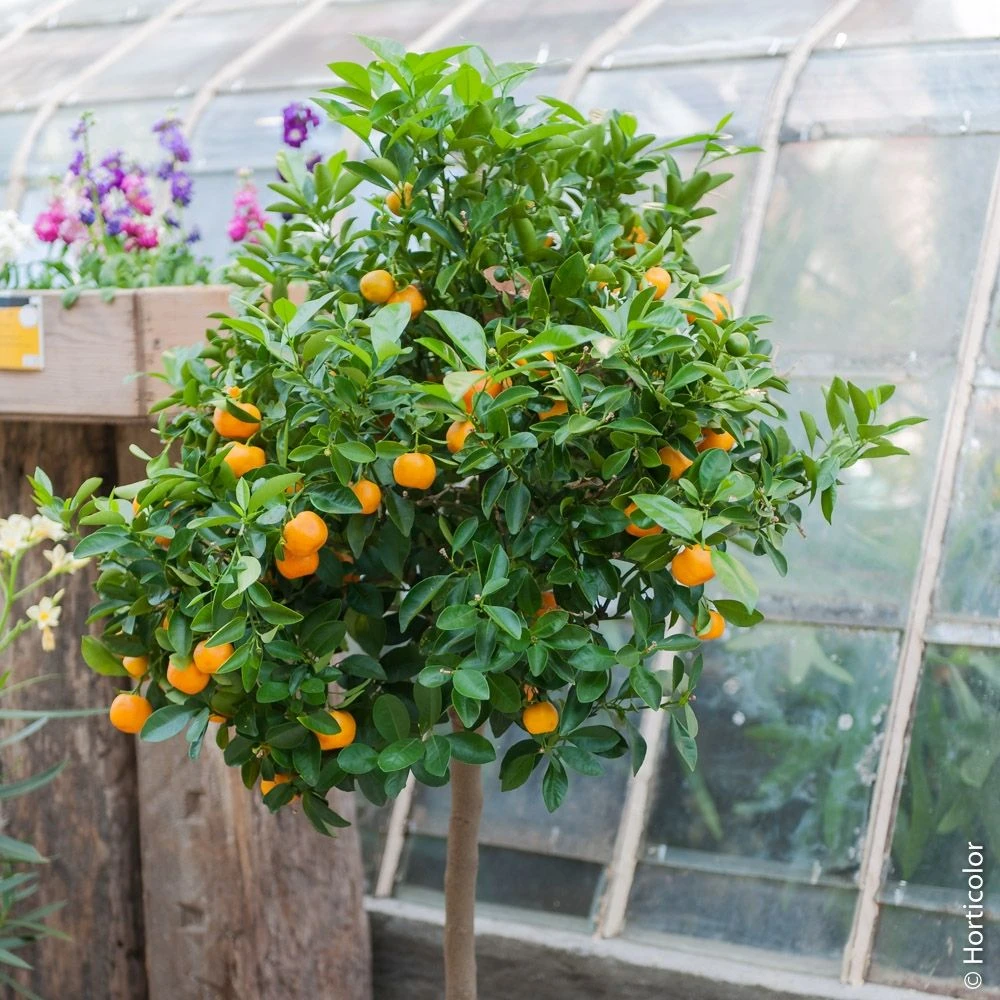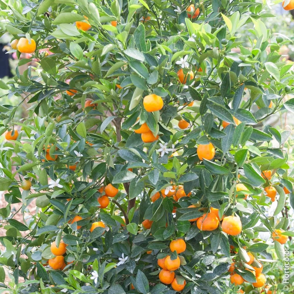 Originaire des Philippines, le calamondin mesure environ 2 m de haut et de large une fois adulte. Il porte de jolies feuilles persistantes vert franc. Telles des étoiles, les petites fleurs parfumées blanches constellent la plante une bonne partie de l’année. S’en suivent des fruits jaune orangé qui évoquent des oranges miniatures.