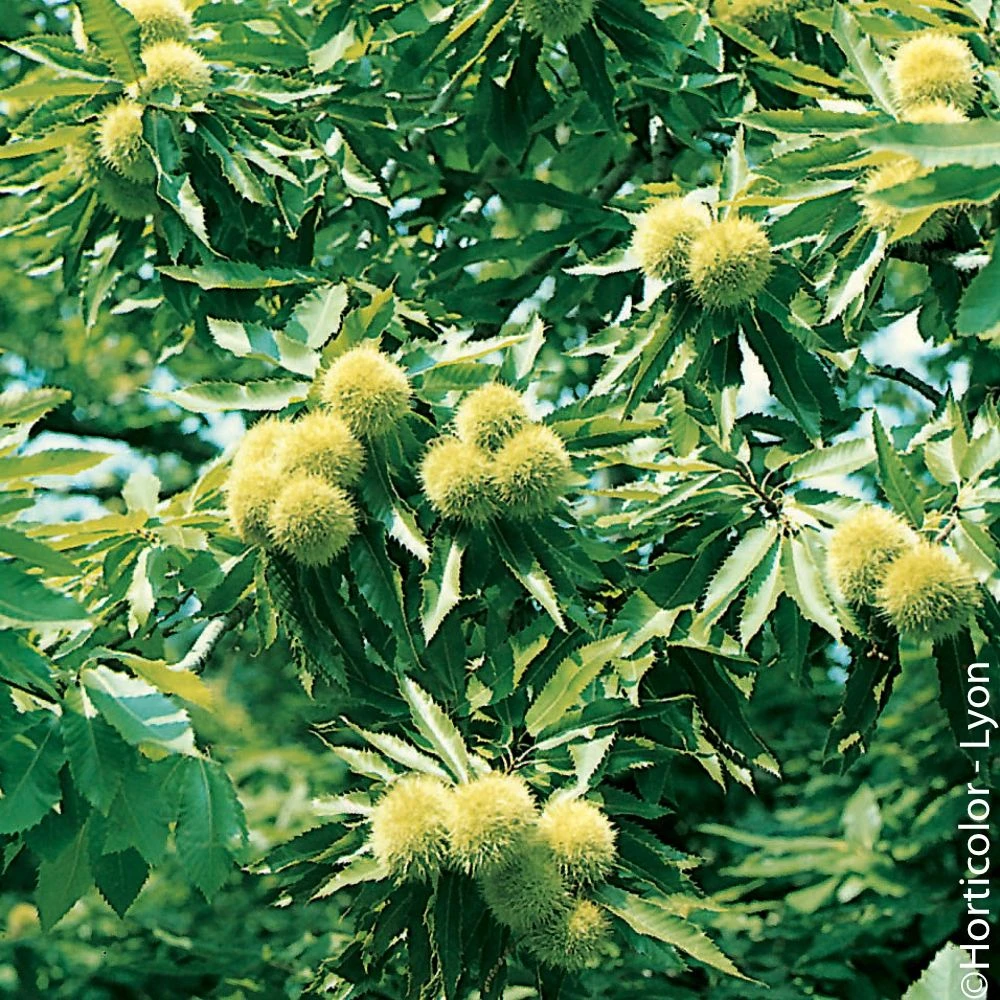 L’une des plus grosses châtaignes du marché ! En début d’automne, le châtaignier ou Castanea sativa ‘Marigoule’ (contraction de Marron de Migoule) offre de grosses châtaignes au goût sucré qui se conservent bien. Sélectionné en 1986 en Corrèze, ce châtaignier très vigoureux deviendra un grand arbre majestueux et de plus en plus productif avec l’âge.