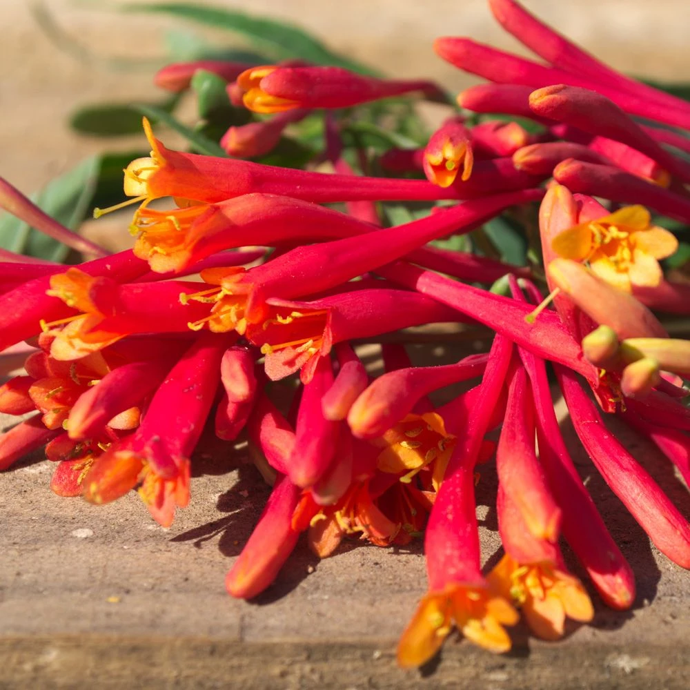 Originale et très colorée, la floraison du Lonicera Cedar Lane cov paraît presque exotique ! Il produit de curieuses fleurs en trompette tubulée d’environ 5-7 cm de long au surprenant coloris rouge vermillon intense, orangé plus clair à l’intérieur.
