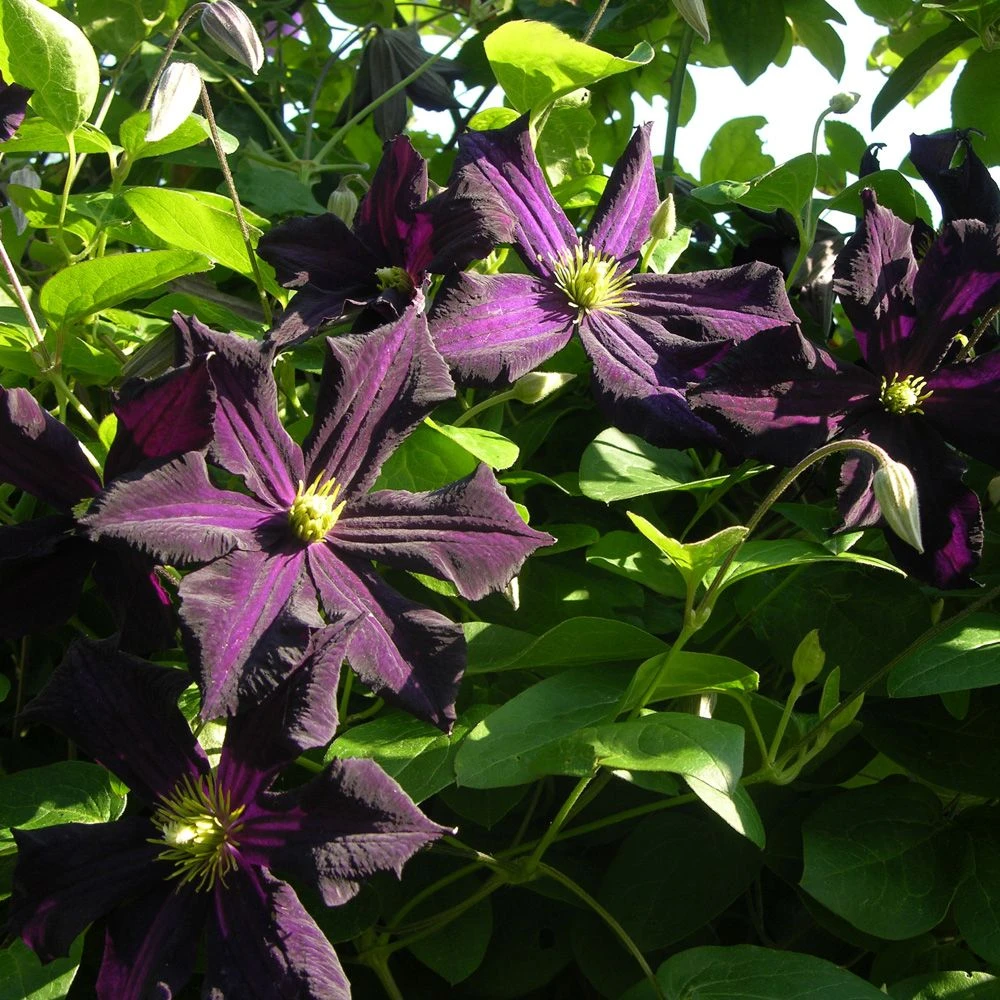 De juin jusqu’en septembre, la clématite ou Clematis X ‘Romantika’ vous offre à foison ses fleurs étoilées de taille moyenne, vêtues d’un riche violet pourpre velouté si foncé qu’elles paraissent presque noires ! Facile à vivre, cette liane vigoureuse et très florifère garnit treillages, colonnes, arceaux, arbustes et haies et s’associe à merveille avec un rosier grimpant à fleurs pâles.