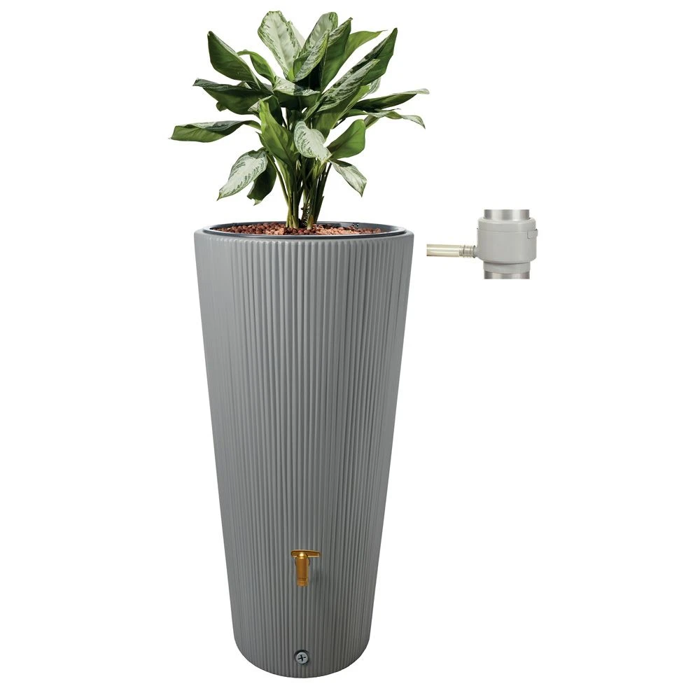Le kit complet 2 en 1 Linus se compose du réservoir 220 litres, son bac à plantes amovible et son géotextile, un système d’attache murale et le joint DN 19/32 (non monté), accompagné du collecteur Eco coloris gris et du robinet en polyéthylène aspect laiton. Dimensions du réservoir 2 en 1 Linus 220 litres : hauteur 120 cm, diamètre base 40 cm, diamètre sommet 58 cm.