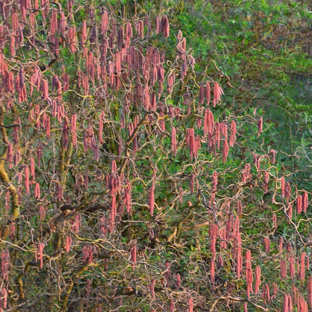 Corylus Avellana Red Majestic Cov ! Cette variété allie le charme du noisetier tortueux et la qualité du feuillage du noisetier pourpre. D’une hauteur de 2,00 m à 2,50 m environ à l’âge adulte, ‘Red Majestic’ a une bonne végétation et des caractéristiques similaires à celles du noisetier tortueux. Le coloris très pourpre du feuillage au débourrement et en début de printemps, s’atténue au cours de l’été pour prendre une teinte plus verte selon les situations. Les fleurs en chatons, en mars, sont également pourpres, et l’enveloppe des fruits l’est plus ou moins.