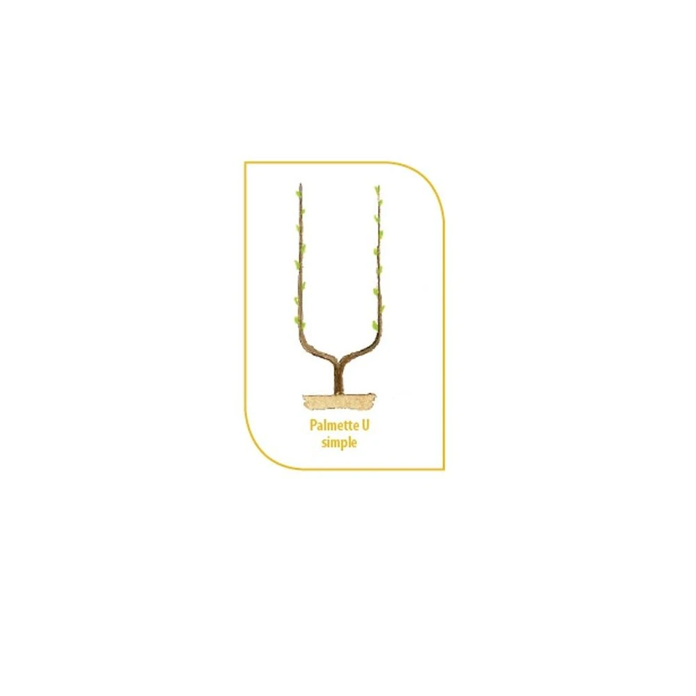 - La palmette U simple : arbre de 3-4 ans (dont 2-3 ans de greffe) en forme taillée U. Le tronc court (30/40 cm environ) porte 2 branches latérales palissées coudées qui forme une silhouette en U. Mise à fruits rapide, 1-2 ans aprÚs plantation. Pour petits jardins et haies fruitiÚres. Nos conseils pour les fruitiers en palmette par ici.
